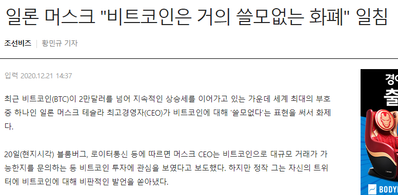 테슬라, 비트코인 1조7천억원어치 구매…"결제수단 허용", 강건택기자, 국제뉴스 (송고시간 2021-02-09 00:05)