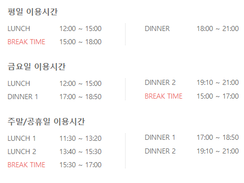 - 금요일 런치 12:00 ~ 15:00, 디너1 17:00 ~18:50 디너2 19:10~21:00, Break time 15:00~17:00