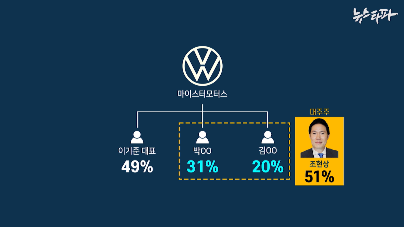- 지인 박모 씨의 부친이 126,531주를 주당 7,206원, 총 9억 1천여만 원에 배정받아 31% 주주가 됐고, 또 다른 지인 김모 씨가 81,629주를 총 4억 8백여 만 원에 받아 20% 주주가 됐다. 이 유상증자 이후 지금까지 이기준 마이스터모터스 대표는 49% 지분을 유지하고 있다.