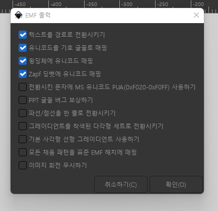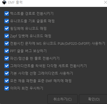 오른쪽 위 파일 클릭 -> 열기 클릭 -> 다운받은 svg 파일 열기 -> 확인 클릭 -> 오른쪽위 파일 클릭 -> 다른이름으로 저장 클릭 -> 중요: 파일형식을 EMF 형식으로 저장 -> EMF 팝업 출력 -> 모두다 체크하기 -> 확인 클릭