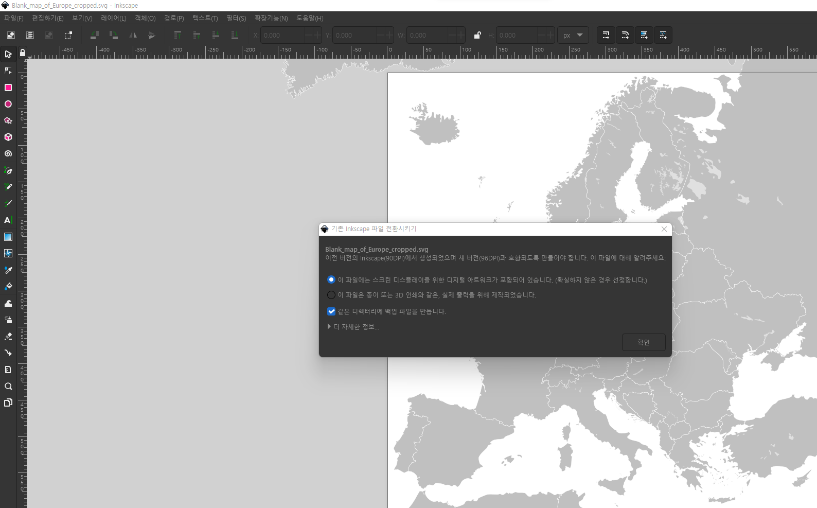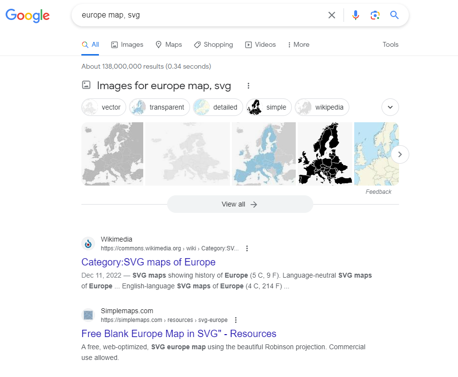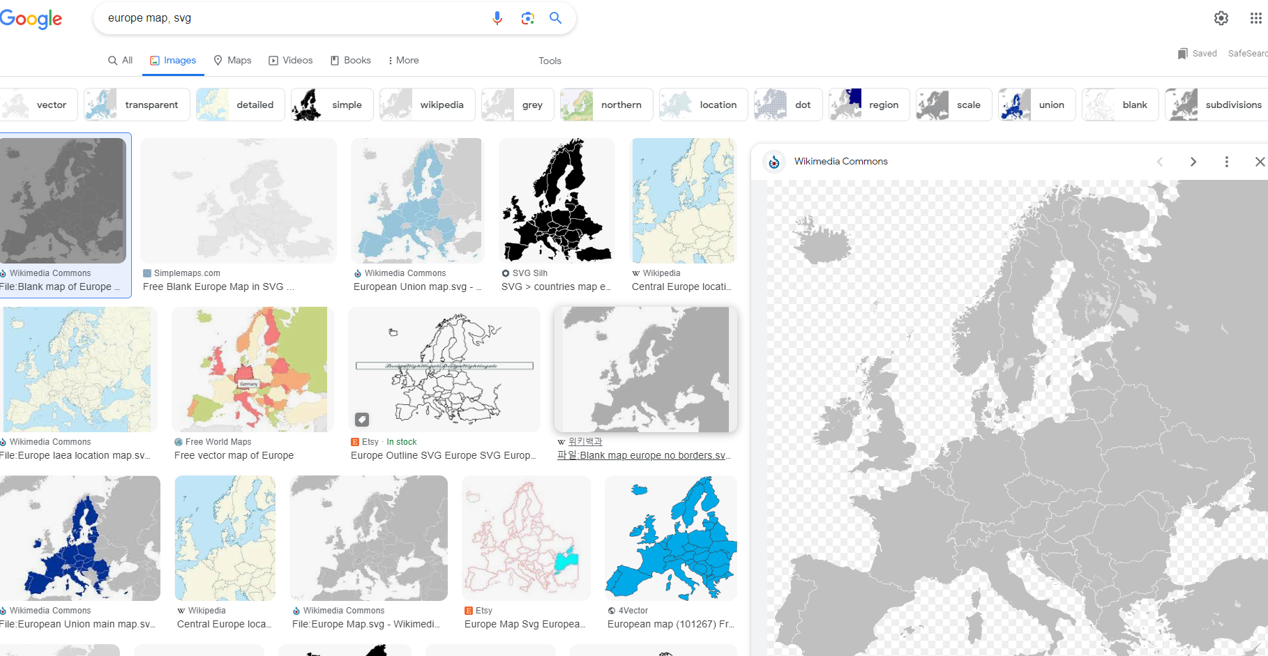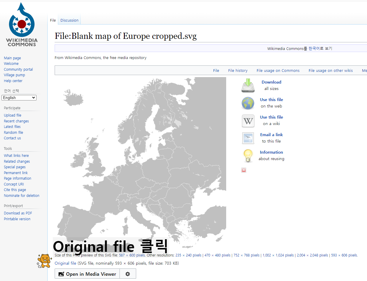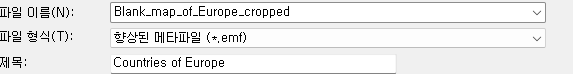 예시) 유럽지도: 구글 검색창에서 europe map, svg 검색 -> View all 클릭 -> 적당해보이는 사진 클릭 -> Original file 클릭 -> 새창이 열리면서 지도가 뜸 -> 지도에서 오른쪽마우스 다른이름으로 저장 -> "중요" 확장자는 svg로 저장되어야 함 (**.svg)