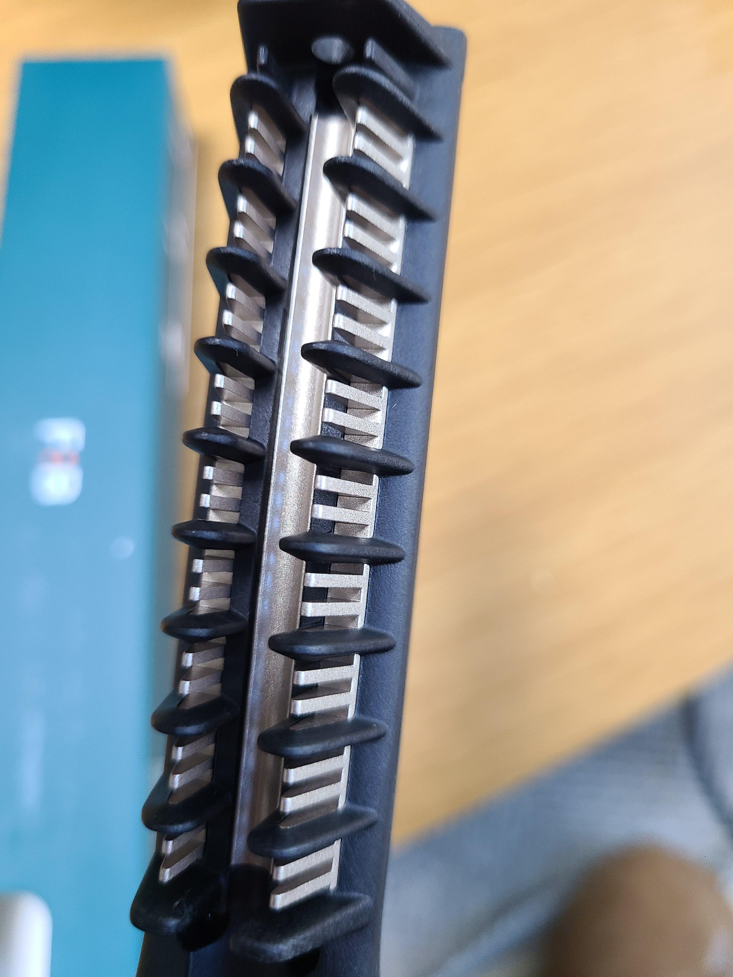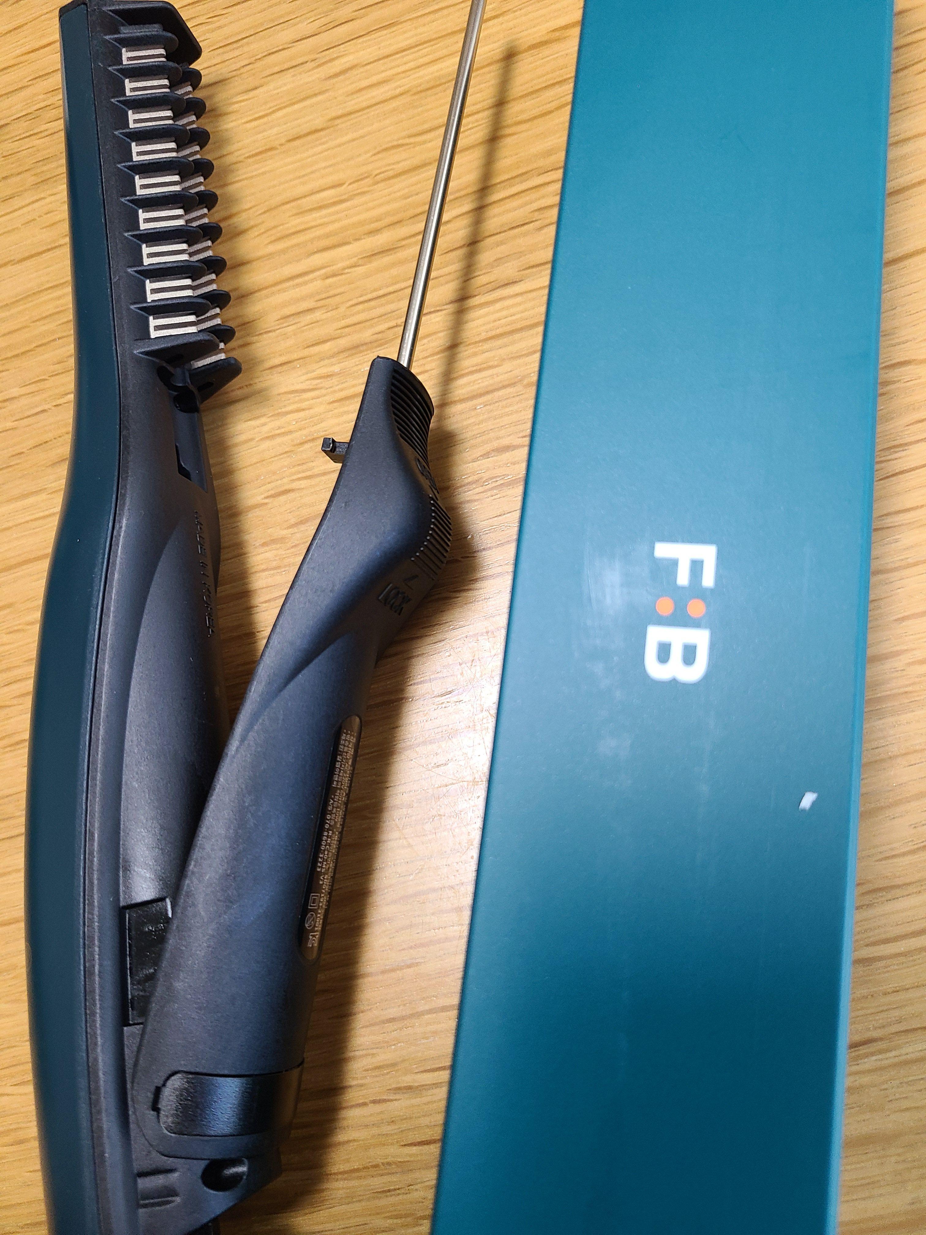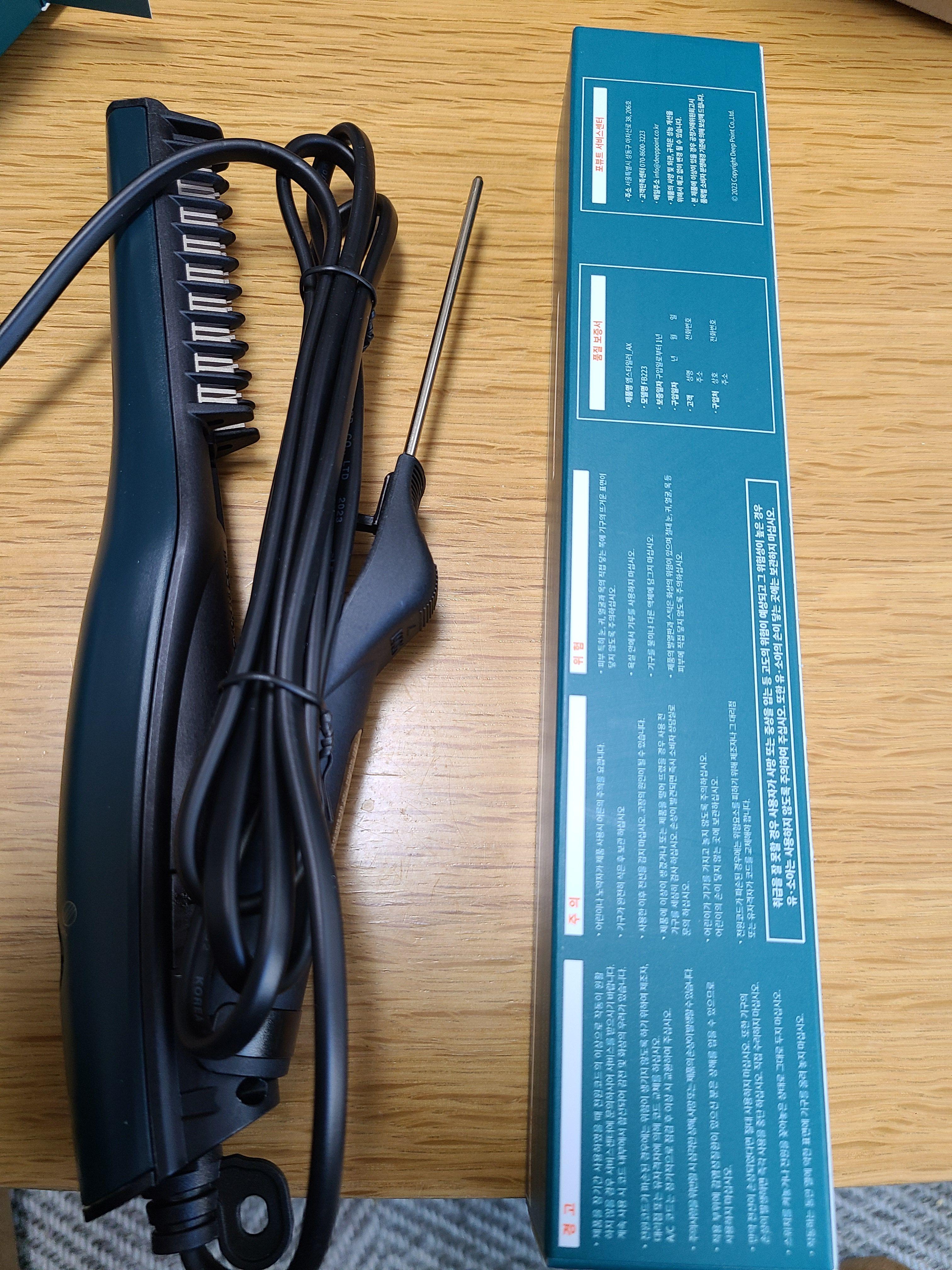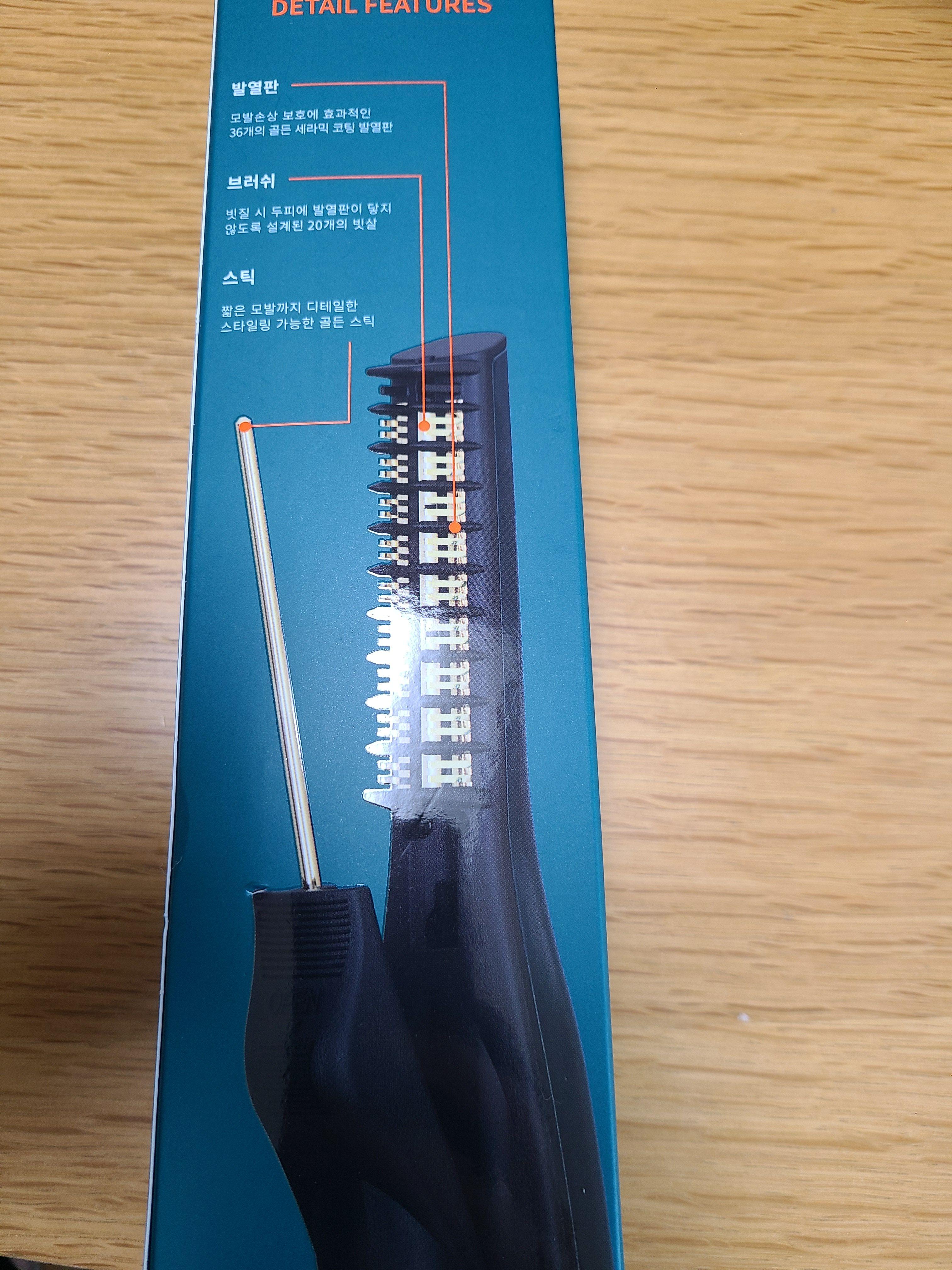 외관에 대한 디테일샷. 발열판 주위에 빗들이 쫙 깔려 있어서 다른 고데기들 보다 옆머리를 타겟으로하는 남자 고데기에 적합하게 디자인 되어 있는 것으로 보인다.