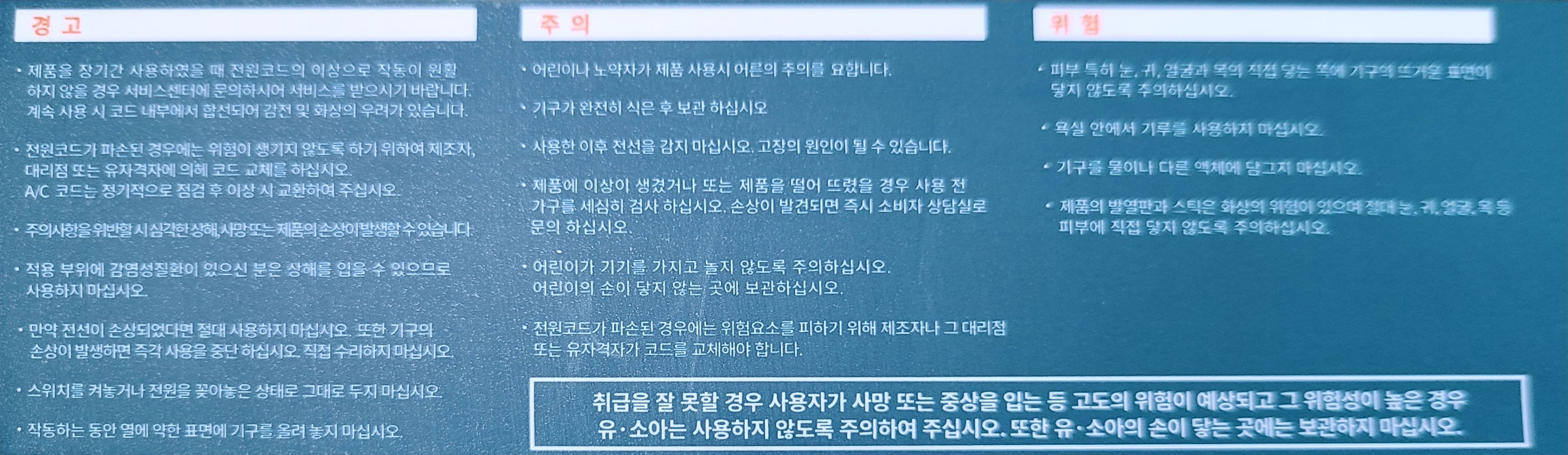 사용시에 경고, 주의, 위험, 사항이 자세하게 적혀 있다.