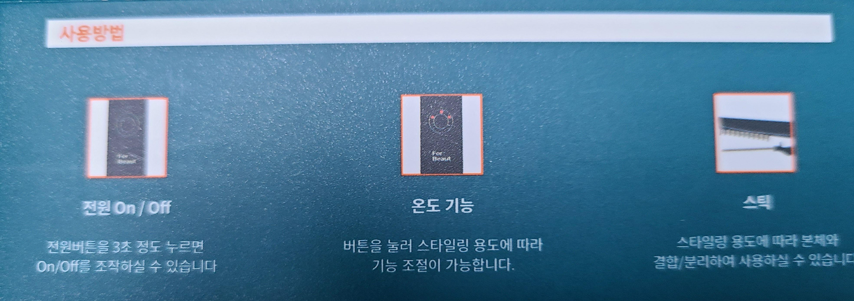 포뷰트 엠스타일러 남자 고데기에 대한 사용방법이 간단하게 설명되어 있다