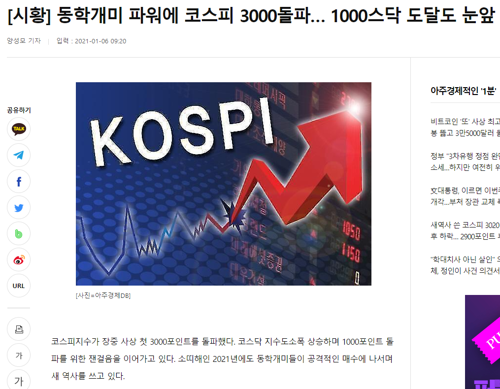 [시황] 동학개미 파워에 코스피 3000돌파… 1000스닥 도달도 눈앞